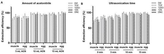 | DIZ; NICA; TOZ; TZS; TZSO [7] | Poultry liver; muscle | Phosphate-citrate buffer (pH 9.7); ACN | Ethylacetate; dichloromethane; hexane | NICA: 301.1/106.9 301.1/136.0 TOZ: 424.0/424.0 * 424.0/41.8 TZS: 456.2/456.2 * 456.2/41.9 TZSO: 440.2/371.2 440.2/41.9 DIZ: 405.0/334.0 405.0/301.0 407.0/336.0 | 2 for NICA 2 for DIZ 1.2 for TOZ 1.6 for TZS 3.2 for TZSO | 6.6 for NICA 6.6 for DIZ 4.1 for TOZ 5.4 for TZS 10.5 for TZSO |