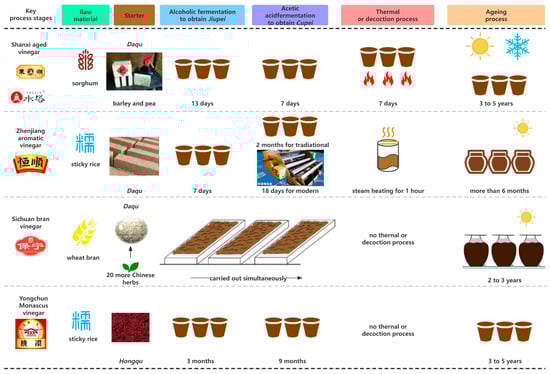 The four most popular CCVs in China include Shanxi aged vinegar (SAV) (using a sorghum raw material and a Daqu starter), Zhenjiang aromatic vinegar (ZAV) (using sticky rice and a Daqu starter), Sichuan bran vinegar (SBV) (using wheat bran, various spices and herbs, and Daqu), and Yongchun Monascus vinegar (YMV) (using red yeast for saccharification, sticky rice, and liquid-state fermentation) []. Additionally, other CCVs, such as Beijing rice vinegar (BRV), Zhengrong rice vinegar (ZRV), and Zhejiang rose vinegar, are also popular. Unlike vinegars in other part of world, like Italian balsamic vinegar produced from grapes [], Middle East vinegar from dates [], and Philippines vinegar from coconut palm and sugar cane [], the unique flavor of CCV can be attributed to the fermentation technique and raw materials used during production, including buckwheat, sorghum, corn, wheat, barley, and rice. CCVs are produced via solid-state fermentation, involving microbial proliferation on solid, moist substrates in the absence of free-flowing water, differing from the liquid fermentation technique used for Italian balsamic vinegar and sherry vinegar or slow traditional acetification processes (the Orléans or French method) for wine vinegar [].