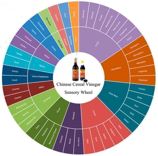 A lexicon with accurate definitions and references that can consistently distinguish and describe the sensory attributes will be helpful to producers, salespeople, researchers, and consumers, among other stakeholders in the CCV value chain. This study reviewed all the possible descriptors for the aroma and flavor of CCVs, irrespective of the area of origin, type, and raw material (Table 2). Trained panels of tasters developed a lexicon for describing CCVs, which defined and referenced 23 significant olfactory descriptors, namely chocolate, toasted, meat broth, licorice, walnut, yogurt, fruity, glue, honey, leather, caramel, burnt, flour, vanilla, spicy, smoked, green, bitter almond, mildew, rancid, boiled vegetable, butter, and woody flavors []. However, the judges in this study were all of Italian descent and were not very familiar with CCV. Another Chinese study selected ten olfactory terms for CCV aroma, namely sour, sweet, burnt, sauced, fruity, bran, incense, incense smoke, grain, alcoholic, and flowery []. A comprehensive, standard, and dynamic lexicon is necessary for characterizing the aroma and flavor of CCVs in both English and Chinese.