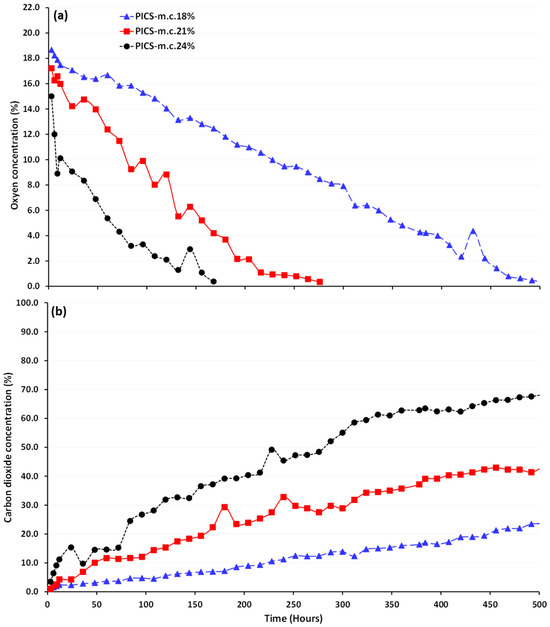 The fixed effects pertaining to m.c. exhibited distinct patterns: negative for O2 consumption and positive for CO2 increase. Specifically, an m.c. increase from 18% to 21 or 24% corresponded to a notable decrease in O2 concentration of −5.50 to −9.91 percentage points, respectively. On the other hand, the CO2 concentration exhibited the opposite trend, with significant increases of 14.57 and 31.86 percentage points when m.c. rose from 18% to 21 or 24%, respectively.