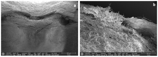 Photo of the kernel surface of maize kept at 24% m.c. (a) before and (b) after (21 days) storage in hermetic bags in a growth chamber maintained at 25 °C and 80% relative humidity. Image magnification (150×) by FEI Nova-Nano field emission SEM machine, with a low vacuum detector (LVD). Images taken at the Purdue Life Science Microscopy Facility (LSMF).