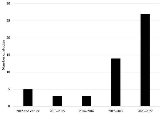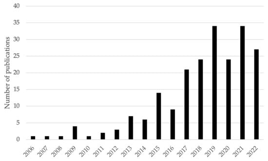 As national and export food demands increase in Peru (e.g., [22]), the country faces serious public health and, by extension, economic challenges associated with the presence and bioaccumulation of metals in food and medicinal products. The “Platform of People Affected by Toxic Metals”, a Peruvian organization that seeks to protect victims of this growing environmental problem, estimates that more than 10 million Peruvian citizens are somehow affected by metals ingested through food and medicinal products. Taking this into account, the number of Peruvian studies that focus on this important topic (metal bioaccumulation in food and medicinal products) and published in peer-reviewed English journals has increased significantly in recent years (see Figure 1 and details in Table S1, Supplementary Materials), where crops, fish and medicinal plants are the primary research topics.