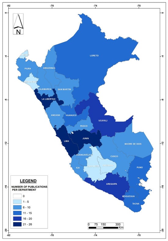 The geographic distribution of scientific publications found in this national review is illustrated in Figure 3. Most publications related to metal bioaccumulation are concentrated in the Department of Lima (10%) followed by Junin and La Libertad (8% each), Arequipa (7%), and Ucayaly (7%). As discussed later, this geographic distribution can be linked to local resources. However, it is important to mention that Lima has ten national universities, while regions usually have between one and three, which could explain the large concentration of studies from the country’s capital department.