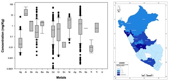 (Left): Distribution (boxplots) of nationwide metal concentrations documented in Peruvian macroinvertebrates and mollusks. (Right): Geographic distribution of published bioaccumulation-related studies developed for macroinvertebrate- and mollusk-based food products in Peruvian administrative departments (please refer to Figure 3 for details). The WHO standards are not displayed because they are specific to the food/medicinal type.
