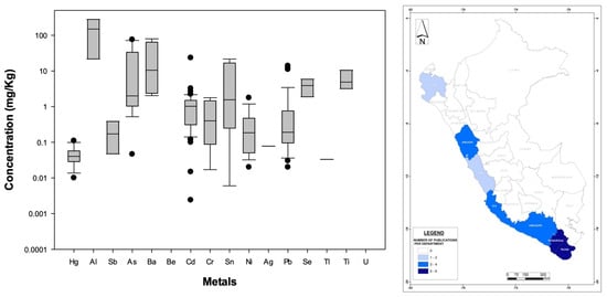(Left): Distribution (boxplots) of nationwide metal concentrations documented in other food categories in Peru. (Right): Geographic distribution of published bioaccumulation-related studies developed for food products based on other categories in Peruvian administrative departments (please refer to Figure 3 for details). The WHO standards are not displayed because they are specific to the food/medicinal type.