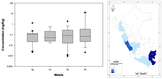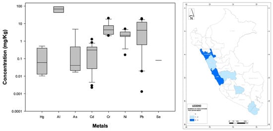 (Left): Distribution (boxplots) of nationwide metal concentrations documented in Peruvian fish-derived food/medicinal products. (Right): Geographic distribution of published studies related to bioaccumulation developed for fish-based food products in Peruvian administrative departments (please refer to Figure 3 for details). The WHO standards are not displayed because they are specific to the food/medicinal type.
