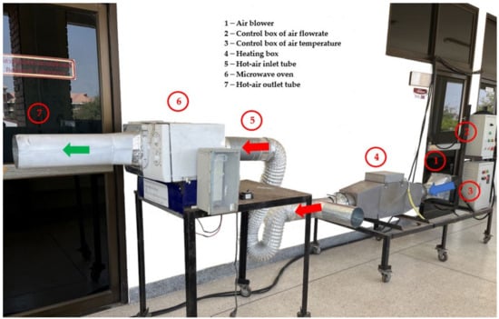 A domestic microwave oven (2.450 GHz., MS23F300EEK, Samsung, Chon Buri, Thailand) was modified so that hot air could be introduced into an oven cavity, as shown in Figure 1. The direction of air flow is indicated by arrows. The ambient air is denoted by a blue arrow, the hot air by a red arrow, and the moist warm air by a green arrow. Ambient air, supplied by a blower (number 1), was heated in a 10-kW electric box (number 4) before entering the microwave oven (number 6) through an inlet tube (number 5). Hot air with flow rate of 0.02 m3·s−1 was introduced into the drying chamber with temperature controlled using a PID temperature controller (Model MAC-3D, Shimax Co., Ltd., Akita, Japan). Rotational speed and microwave power were controlled using a microcontroller. For each experimental run, 200 g of cooked samples was placed on a drying disc. The three operating parameters tested were a hot air temperature ranging from 70 °C to 90 °C, a microwave power of 150–450 W, corresponding to initial intensities ranging from 0.75 to 2.25 W·g−1, and a rotational speed from 0.07 to 0.20 Hz. A 33 full factorial design was used to study the effects of these parameters to optimize the drying conditions. As they were pre-cooked prior to drying, the dried samples were named ‘quick-cooking red beans’ (QCRB) and are referred to in this way throughout this paper.