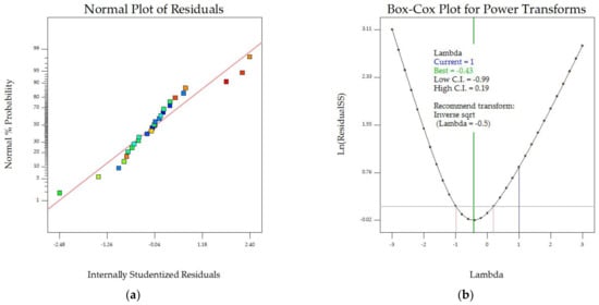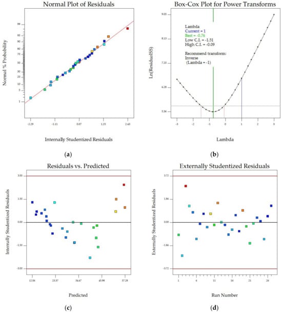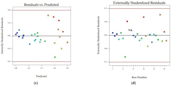 Figure 2 summarizes the model diagnostic and influence plots of the effective diffusivity coefficient (De). The normal plot of residuals in Figure 2a shows that the model accurately explained the relationship between drying factors and De value. However, the Box–Cox transformation, which uses a power function to adjust experimental data for statistical analysis [30], shows that the current lambda (1) was not in the confidence interval of 95% (−0.99 ≤ λ ≤ 0.19). In this case, an inverse square transformation (lambda = −0.5) was recommended. Figure 2c shows that the residuals were randomly distributed between −3 and +3. A plot of externally studentized residuals for each experiment run number for the De value (Figure 2d) revealed that most produced low residuals without any outlier.