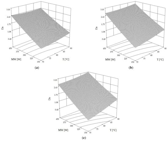 Three-dimensional contour plots of the effective diffusivity coefficient (De, ×10−9 m2·s−1) as affected by hot air temperature (T) and microwave power (MW) at rotational speeds (RDS) of (a) 0.07 Hz, (b) 0.13 Hz and (c) 0.20 Hz.