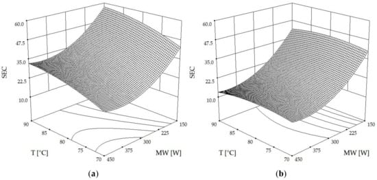 In addition to the effective diffusivity coefficient (De), in this work, the specific energy consumption (SEC) was evaluated to analyze drying effectiveness. Table 3 displays the significant second-order polynomial function model of SEC, with a p-value of 0.0001 (p < 0.05) and an F-value of 12.16 (>4). Monomial factors of T and RDS were insignificant model terms, while the MW factor and their interaction term of T*RDS were significant, with an extremely low p-value less than 0.001 and 0.005, respectively. The “Pred R2” value of 0.6004 was in reasonable agreement with the “Adj R2” value of 0.7984. The signal-to-noise ratio was measured using the “Adeq Precision” value, with a desirable value being greater than 4. The “Adeq Precision” was 11.12, indicating an adequate signal. The model was therefore used for further optimization. Among the three factors tested, MW was the most important one as it had the highest F-value, while hot air temperature was the least pronounced parameter.