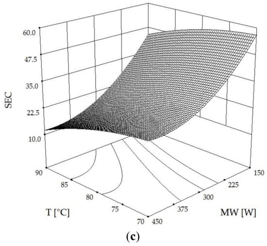 Three-dimensional contour plots of SEC (MJ·(kg·h−1)−1) affected by hot air temperature (T) and microwave power (MW) at rotational speeds (RDS) of (a) 0.07 Hz, (b) 0.13 Hz, and (c) 0.20 Hz.