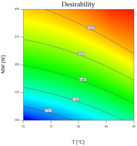where, Li and Ui are the lower and upper acceptable values for the response, respectively. s and t are a weight determining the importance of the response being near its maximum and minimum value, respectively. This mathematical approach optimizes multiple process responses simultaneously, assigning each one value between 0 and 1, where 1 signifies the utmost desirability and 0 denotes unsatisfactory outcomes. The desirability functions for each response for maximum and minimum value were defined and subsequently used maximizing the global desirability (D) expressed in Equation (16) with m representing the total number of responses [25]. The attainment of the highest global desirability (D) indicated the compromise solution, signifying the most effective set of conditions determined for the drying.