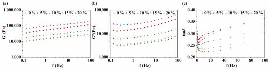 The dependence of rheological properties of dough on the proportion of PSY. (a) The effects of the concentration of PSY (0, 5, 10, 15, and 20%) on the storage modulus (G′). (b) The effects of PSY on the loss modulus (G″). (c) The effects of PSY on the phase shift tangent (tanδ) value.