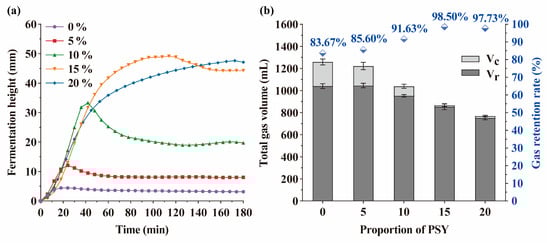 The dependence of rheo-fermentation properties of dough on the proportions of PSY. (a) Different proportions of PSY (0, 5, 10, 15, and 20%) were included in the dough, and the fermentation height of the dough was determined. (b) The effects of PSY on the gas volume and retention rate of dough were determined. Vc, loss gas volume; Vr, retention gas volume. The experiments were performed in triplicate.