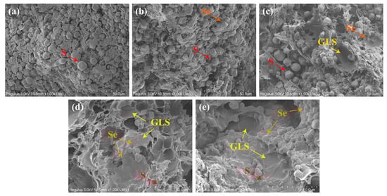Dependence of dough microstructure on the proportion of PSY. (a–e) SEM images of dough samples. S, starch particles; Se, starch particles embedded in the dough; GLS, gluten-like structure.