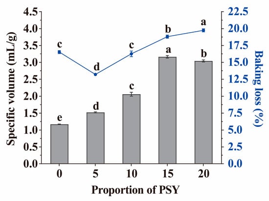 The specific volume and baking loss of bread with different proportions of PSY. Letters indicate significant differences (p < 0.05). The experiments were performed in triplicate.