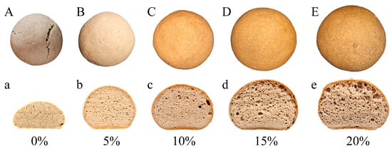The colour of bread is a significant factor in its appeal to consumers; GF bread often has a lighter hue that is less appealing to consumers. As illustrated in Table 1, as the proportion of PSY increased, the L* value, which is an indicator of the darkness of the crust, decreased and the a* and b* values, which indicate red and green or blue and yellow hues, increased. The crust of PSY-added bread displayed a toast tan colour (Figure 5), which can be attributed to the enhancement in the Maillard reaction during baking [40]. Meanwhile, the L*, a*, and b* values of the bread crumbs also increased with the addition of PSY to the dough, primarily due to the natural colouring properties of PSY itself. As is shown in Figure 5A, the control bread exhibited cracks on its crust owing to the low water-holding capacity of the dough. The addition of PSY resulted in bread with improved physical characteristics, such as even crusts and an absence of cracks (Figure 5b–e). The addition of PSY enhanced the overall appearance and visual appeal of the bread.