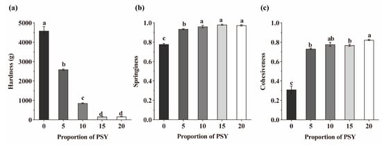 Textural properties of bread with different proportions of PSY. (a–c) The hardness (a), springiness (b), and cohesiveness (c) values of breads made with the noted proportions of PSY were determined with a texture analyser. Letters indicate significant differences (p < 0.05).