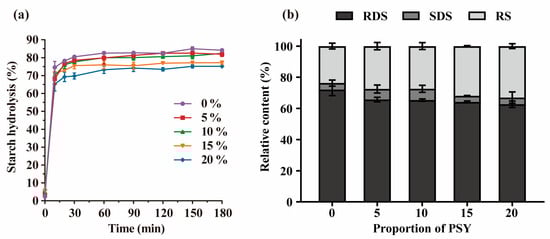 The starch hydrolysis curve (a) and starch compositions (b) of bread with different proportions of PSY. RDS, rapidly digestible starch; SDS, slowly digestible starch; and RS, resistant starch.