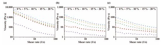 Rheological analyses of the digesta of breads with varying proportions of PSY. (a–c) Steady shear viscosity of the digesta at three different digestion times: 0, 20, and 120 min, respectively.