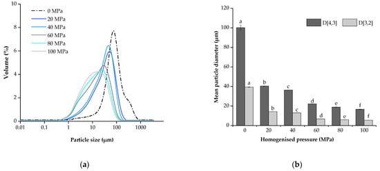 The effect of the homogenisation treatment on the LLB volume (D [3,2]) and surface weight (D [3,2]) is shown in Figure 1b. The values of both D [4,3] and D [3,2] significantly decreased (p < 0.05) due to the homogenisation pressure, with a reduction of 78% and 82% in D [4,3] and D [3,2] in the range of 0~60 MPa, while a reduction of 23% and 15% in D [4,3] and D [3,2] occurred in the range of 60~100 Mpa, respectively. This result indicated that both large and small particles were greatly affected when the samples were treated under less than 60 MPa, while large and small particles were less affected when the pressure was higher than 60 MPa, but large particles were more seriously damaged than small particles. The damage behaviour of particles under homogeneous pressures appeared asymptotic. Yu et al. also reported similar patterns of homogenisation effect on particles [34]. As explained by Augusto et al. about the effect of homogenisation on suspended particles, the remaining cells were destroyed during the homogenisation process, and the fragments in the liquids were broken up into smaller particles [31]. However, these small fragments were less susceptible to fragmentation than slightly larger or whole cells.