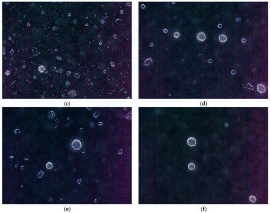 Plate of electron microscope test of lotus seed and lily bulb beverage by homogenisation: (a) 0 MPa; (b) 20 MPa; (c) 40 MPa; (d) 60 MPa; (e) 80 MPa; and (f) 100 MPa.