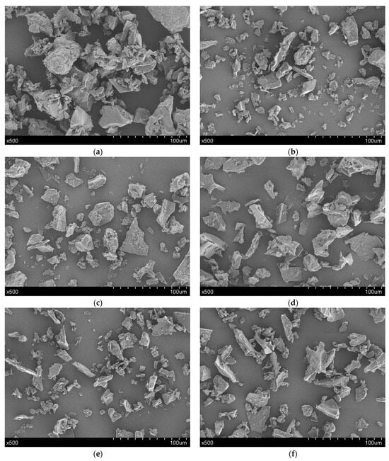 In order to further analyse the microstructure of LLBs, we used a scanning electron microscope to observe it. As shown in Figure 3, the structural morphology of the sample under 0 MPa changes drastically compared to those under 20~100 MPa. The surface of the samples under 0 MPa is rough, aggregated, and stacked, showing irregular geometry shapes, with scattered small particles visible around them; these accumulated aggregates may be formed by some complete proteins in cells or plants after lyophilization and grinding; meanwhile, irregular geometric structures are formed, while smaller particles are related to starch particles, fibre particles, or other substances [35]. In addition, samples under 20~100 MPa stretch after homogenisation treatment, gradually forming irregular lamellar structures with sharp edges and smooth surfaces, which are fragmented into smaller particles. As observed through a particle size analysis, these suspended particles were strongly decomposed under high pressure, leading to the formation of small particles such as cellular materials, cell wall fragments, fibre fractions, and polymers. Similar microstructural changes were obtained by Huang et al. in their study on homogenisation-treated sugar beet pulps (5~100 MPa) [36]. In fact, homogenisation has been evaluated to affect microstructural changes not only in many fruit and vegetable juices or products such as pumpkin [37] and mango juices [38] but also in a number of protein beverages, such as peanut milk [39] and skim milk powder [40]. These results indicated that homogenisation strongly affected the particle size, particle number, and microstructural changes in suspensions.