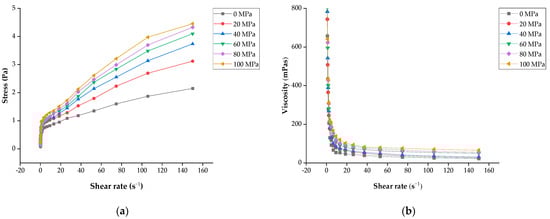 Rheological properties reflect the deformation and flow behaviour of substances. The rheological behaviour is mainly related to the types of interactions between the particles and molecules responsible for gel formation [41]. The effect of different homogenisation pressures on LLBs was described through the response of the shear rate and shear stress as well as the shear rate and apparent viscosity in rotation mode (Figure 4). The shear stress of all samples increased with the shear rate, while the apparent viscosity decreased with the increase in the shear rate. In other words, the samples all exhibited non-Newtonian fluid properties (which refer to the fluid with a nonlinear correlation between the shear rate and shear stress) and shear-thinning behaviour, which presented the pseudo-plastic behaviour [42]. An increasing shear stress was observed with an increasing shear rate among the LLB samples under different homogenisation pressures. Specifically, the apparent viscosity of the samples under 20~100 MPa was consistently higher than that of the sample under 0 MPa throughout the shear rates we observed. The shear stress increased significantly (p < 0.05) in the range of 0~60 MPa, which might be due to the interaction force between particles and the formation of interconnected gel networks, thereby enhancing the internal structure of the samples [43]. However, the shear stress did not change significantly (p > 0.05) with an increase in pressure of 60~100 MPa because changes in the shear stress might be related to the differences in particle volume fractions, power of interparticle interactions, and particle sizes, just as in the previous results of particle sizes. There was no significant difference (p > 0.05) in the homogenisation pressure of 60~100 MPa, which was consistent with the results of studies on walnut yogurt and pomelo peel flour [44,45].