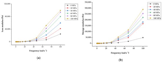 In this study, G′ and G″ significantly increased (p < 0.05) in the range of 0~60 MPa, indicating that the elasticity and viscosity of LLBs were significantly improved through homogenisation within this homogenisation pressure range. However, with a further increase in pressure, the increases in G′ and G″ were insignificant (p > 0.05) within 60~100 MPa, indicating that the continued increase in pressure had less effect on the viscoelasticity of LLBs. The increase in G′ and G″ might be due to starch gelatinisation and protein denaturation in the beverage system caused by homogenisation pressure [43]. It has been previously reported that differences in flow characteristics might be due to the solubilisation of large particles such as starch and pectin in the system or the changes in beverage particle morphology and the interactions among the particles affected by homogenisation [48]. Tan et al. explained that the differences in the viscoelasticity of tomato juice caused by different homogenisation treatments resulted from the decomposition of the system-suspended particles during processing [49]. Therefore, our results showed that homogenisation had an ameliorating effect on the viscoelasticity of LLBs and was most effective at 60 MPa, which meant that the deformation resistance of the beverage was related to different pressures. Hu et al. showed that the G′ and G″ values of mango juice increased with the gradual increase in the range of test frequencies (0.1–10 rad·s−1); the G′ was always greater than G″ among all samples, and mango juice had a weak gelling property [50]. Bi et al. showed that an increase in homogenisation pressure significantly enhanced the viscoelasticity of soybean-isolated protein emulsion gels and that a certain pressure (less than 60 MPa) contributed to the formation of a more stable three-dimensional network structure of soybean-isolated protein emulsion gels [51]. However, when the homogenisation pressure was too high (up to 80 MPa), the stability of the emulsion structure was affected. Luo et al. found that the homogenised quinoa protein samples had weak gel properties and that G′ and G also increased gradually with increasing pressure (0~50 MPa) [16].