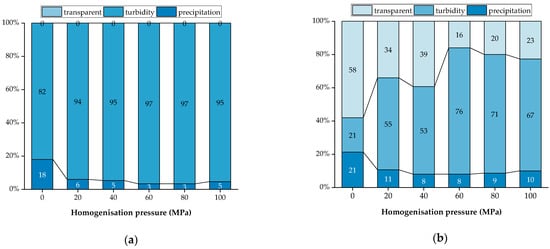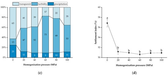 Figure 1 illustrates the effect of several homogenisation pressures on the particle size distribution of LLB samples. As shown in Figure 1a, the average particle size of LLBs is reduced after the homogenisation treatment, which is consistent with the observations in previous studies on fruit and vegetable products, such as lily pulps [30], rosehip nectar [24], tomato juice [31] and blackcurrant juice [32]. Gul et al. found that cavitation, friction, shear, and turbulence phenomena were generated after homogenisation, and as the homogenisation pressure increased, suspended particles such as cellular debris, polymers, and fibrous particles in the samples were further broken down into smaller sizes [33].