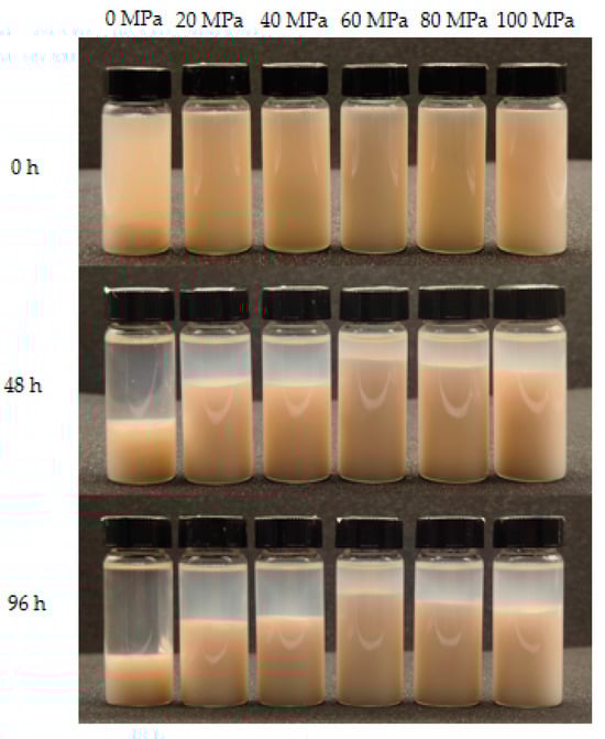 On the other hand, we observed that the sample under 0 MPa had the highest sedimentation rate within 96 h, with the sediment increasing from 18% to 25%, while the high-pressure-treated samples had a lower sedimentation rate, with an increase of only 5% in the precipitation rate of the samples under 60 MPa, suggesting that the samples treated by homogenisation had better stability. According to Stokes’ Law, the sedimentation rate of ions is proportional to the diameter of the particles and the density difference between particle density and fluid, which is inversely proportional to the fluid viscosity [23]. Therefore, the changes in IS during homogenisation are related to the particle size and stability of the homogenised samples. These results are consistent with the sedimentation law of cashew apple juice in a study by Leite et al. [53].