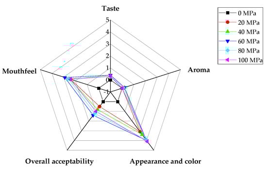 Sensory evaluation is a qualitative and quantitative measurement as well as analysis of food products with the help of people’s five senses, psychology, and physiology, which helps to ensure consumer acceptance and satisfaction with product quality. The related attributes of appearance, colour, aroma, taste, mouthfeel, and overall acceptability were included in the sensory evaluation of the LLB (Figure 8). Appearance and colour are important aspects in evaluating beverages. Samples homogenised at 20~100 MPa were all significantly different (p < 0.05) compared to the sample under 0 MPa, which was consistent with the results of turbidity and IS, indicating that the sample under 0 MPa simply flowed through the homogeniser without producing changes in its stability. Aroma is an important part of sensory evaluation—the changes that will affect the acceptance of consumers. Our results showed no significant difference among the aromas of the homogenised samples (p > 0.05), probably due to the fact that the two vegetables, lotus seeds and lily bulbs, had less pronounced aromas of their own. Mouthfeel and taste scores indicate whether a beverage has a balanced sugar/acid ratio and a pleasant fruit or vegetable flavour. The homogenised samples had a significantly better (p < 0.05) mouthfeel compared to the sample under 0 MPa, indicating that the homogenisation treatment had a positive effect on the mouthfeel of LLBs. However, homogenisation had an insignificant effect on taste, and there was an insignificant difference between samples under 20 to 100 MPa compared with the sample under 0 MPa (p > 0.05). Regarding the overall receptivity, the judges were satisfied with the LLB samples, with the highest receptivity in the samples under 60 and 80 MPa.