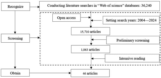 Following this paper’s research topic and purpose, the authors conducted a literature search based on the “Web of Science” database, with keywords, abstracts, and titles as search criteria. The search items for production diversity were “crop diver*”, “plant diver*”, “production diver*”, and “biodiver*”; and the search terms for dietary diversity were “diet diver*” and “food security”. The research literature informed the selection criteria, focusing solely on studies that directly examined the relationship between agricultural production diversity and dietary diversity as their primary focus. Studies that merely mentioned production diversity and dietary diversity in passing in the introduction or discussion sections, even if they touched upon other aspects related to production diversity or dietary diversity, were excluded. According to this selection criterion, 46 articles corresponding to the research criteria were obtained (see Figure 1).