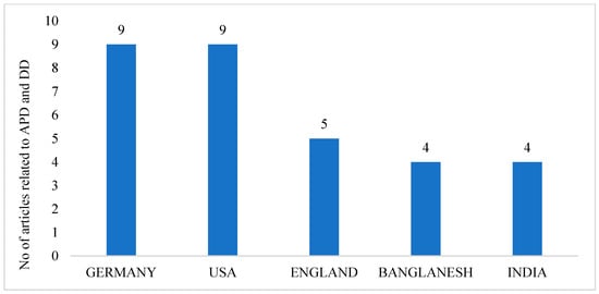 Research in the field of agricultural production and dietary diversity mainly focuses on a few countries. Figure 3 provides the top five ranking countries based on articles published by authors affiliated with institutions in a particular country, with researchers from Germany and the United States of America contributing over a third (37.5%) of the total research output in the field. In addition, research from the UK, Bangladesh, and India is also increasing. Notably, more relevant research is needed in China. Therefore, the results of the country rankings reflect the future direction of research in a given country and the lack of it at this stage.