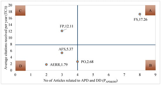 FS is situated in quadrant A, indicating high performance both quantitatively and qualitatively. On the other hand, FP is placed in quadrant C, demonstrating high citations and room for growth in terms of publication quantity. In contrast, AFS, AERR, and PO are located in quadrant D, requiring further improvement in both quality and quantity. The results of this study can be used by researchers to spread their research in the field of agricultural production and food safety.