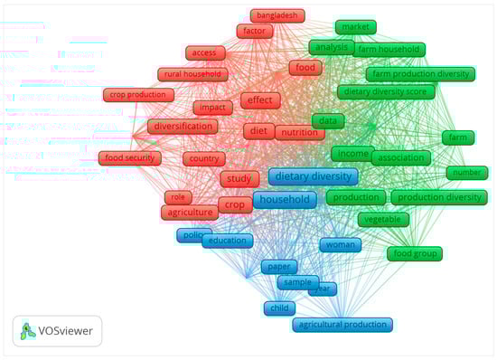 We constructed a visual keyword co-occurrence graph using VOS Viewer. Figure 5 shows three clusters, with different colors indicating each cluster in the figure. The first cluster contains twenty items, the second cluster contains eighteen items, and the last cluster contains twelve keywords. Specifically, the third cluster contains the essential keyword “diet diversity” and the diet status of particular populations, such as women, households, and children. In the first cluster, our study also found keywords related to the country name, such as Bangladesh, country, etc., reflecting the study’s specific origin. The second group of keywords shows the relationship with dietary diversity in the context of agricultural production diversity (association, relationship, and analysis) and the pathways to improve dietary quality (market, market access, and income).
