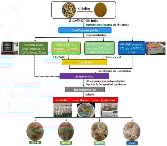 The scheme of polysaccharides extracted from seedless chestnut rose fruit with different extraction technologies. RSP-W, RSPs obtained by accelerated solvent extraction; RSP-C, RSPs obtained by citric acid solution extraction; RSP-A, RSPs obtained by 5% sodium hydroxide/0.05% sodium borohydride solution extraction; RSP-S, RSPs obtained by 0.9% sodium chloride solution extraction.