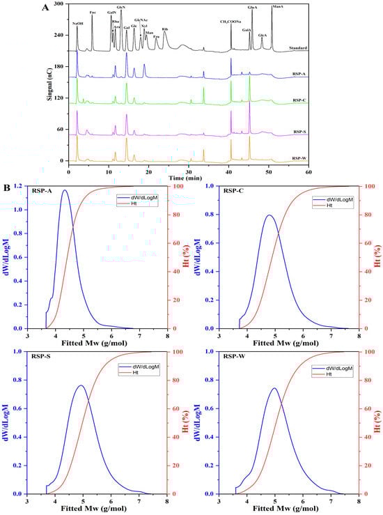 (A) Ion chromatograms of standard monosaccharides and RSPs; (B) molecular weight distribution curves of RSPs.