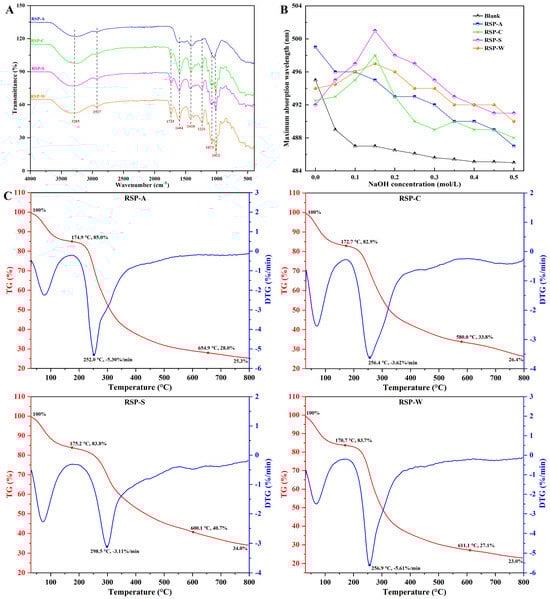 (A) FT-IR spectra of RSPs; (B) effect of RSPs on the absorbance of Congo red at various NaOH concentrations; (C) TG and DTG curves of RSPs.