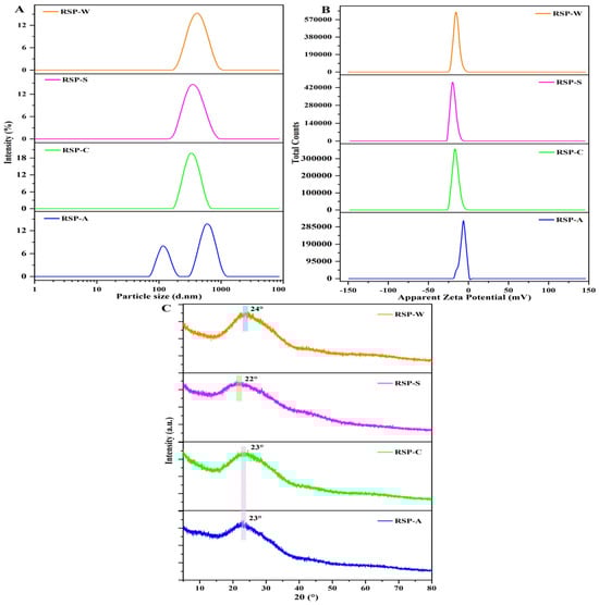 (A) Particle size distribution curves of RSPs; (B) ζ-potential distribution curves of RSPs; (C) XRD spectra of RSPs.