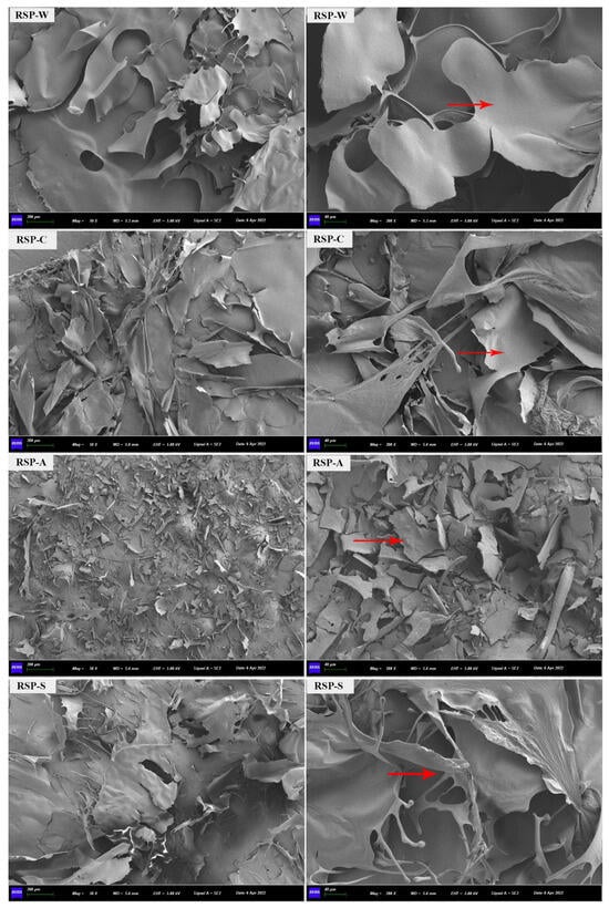 The four RSP samples are depicted in Figure 5, displaying noticeable differences in size and shape in their distinct surface microstructures. RSP-W and RSP-S appeared to have a tightly packed, smooth yet irregular surface with a prominent flaky structure. The aggregation of polysaccharide molecules was responsible for the larger particle size observed in the SEM images of both RSP-W and RSP-S. Contrastingly, RSP-C featured a greater abundance of smaller fragments compared to RSP-W, likely stemming from the cross-linked aggregation of galacturonic acid. Meanwhile, RSP-A presented a relatively dense structure with an irregular shape and a surface texture akin to an atypical brick pattern. Its particles were smaller and more uniformly distributed than those in the other three RSP samples. This uniformity suggested that RSP-A underwent degradation during alkali extraction, possibly related to its lower uronic acid content, resulting in fewer interaction points among particles [53]. The morphologies and microstructures observed supported the findings from the well in line with the results obtained from the analyses of molecular weight and particle size distribution.