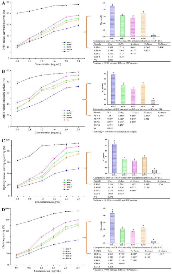 In order to comprehensively assess the antioxidant capabilities of RSPs derived from four different extraction methods, their DPPH, ABTS, and hydroxy radical scavenging activities, as well as their ability to chelate Fe2+, were evaluated based on the procedures detailed in our earlier published research [25,30].
