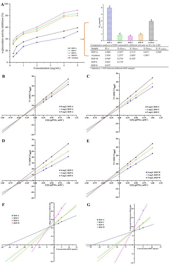 Inhibitory effect of RSPs on α-glucosidase activity (A); Lineweaver–Burk plots for different concentrations of RSP-A (B), RSP-C (C), RSP-S (D), and RSP-W (E) against α-glucosidase activity; the slope of the Lineweaver–Burk plot versus concentration for RSPs (F); the Y-intercept of the Lineweaver–Burk plot versus concentration for RSPs (G). Values for IC50 with no letters in common are significantly different (p < 0.05).