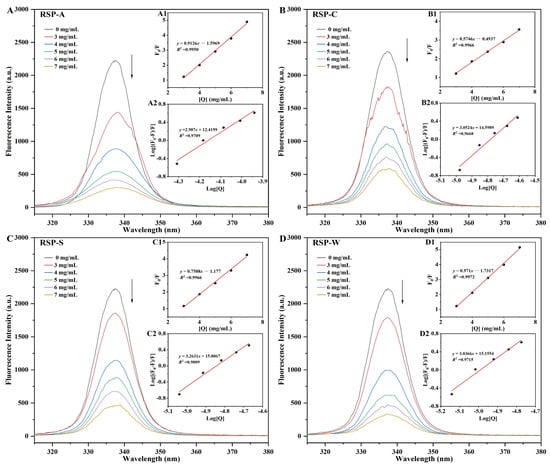 (A–D) Fluorescence spectra of α-glucosidase in the presence of RSPs with different concentrations; the Stern–Volmer plots of α-glucosidase with different concentrations of RSP-A (A1), RSP-C (B1), RSP-S (C1), and RSP-W (D1); the double logarithm regression plots of log [(F0 − F)/F] against log [Q] for α-glucosidase with different concentrations of RSP-A (A2), RSP-C (B2), RSP-S (C2), and RSP-W (D2).