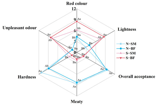 Sensory evaluation of different muscles in normal and spoiled hams. Different uppercase letters (A,B) indicate significant differences between hams with different quality grades for the same muscle (p < 0.05), and different lowercase letters (a,b) indicate significant differences between different muscles for the ham with the same quality grade (p < 0.05). N–SM: normal ham–semimembranosus; N–BF: normal ham–biceps femoris; S–SM: spoiled ham–semimembranosus; S–BF: spoiled ham–biceps femoris.