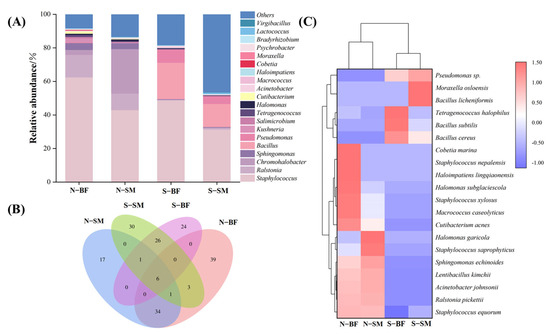 Bacterial genus level histograms (A), Wayne diagrams (B) and bacterial species level heat maps (C) of different muscles in normal and spoiled hams. N–SM: normal ham–semimembranosus; N−BF: normal ham−biceps femoris; S–SM: spoiled ham−semimembranosus; S–BF: spoiled ham–biceps femoris.