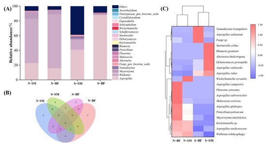 Fungal genus level histograms (A), Wayne diagrams (B) and fungal species level thermograms (C) of different muscles in normal and spoiled hams. N–SM: normal ham–semimembranosus; N–BF: normal ham−biceps femoris; S–SM: spoiled ham−semimembranosus; S–BF: spoiled ham–biceps femoris.