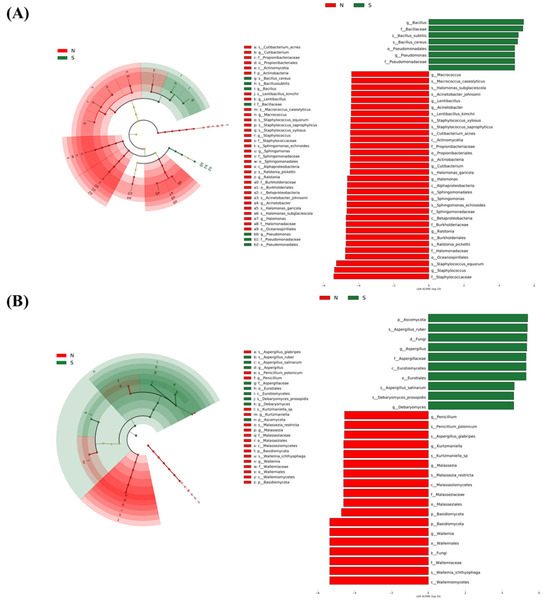 Linear discriminant analysis effect size (LEfSe) of the bacterial (A) and fungal (B) communities with an LDA score > 4.0 and p < 0.05. Cladograms indicate the phylogenetic distribution of microbial lineages among dry-cured hams. Circles represent phylogenetic levels from phylum to species. N: normal ham; S: spoiled ham.