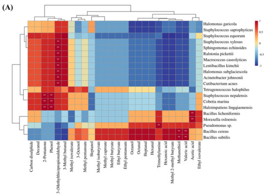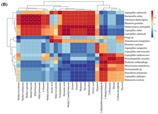Heat map of bacterial (A) and fungal (B) species correlating with key flavour substances in normal and spoiled hams. **: extremely significant (p < 0.01).