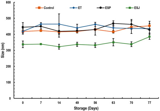 Droplet size stability (nm) of emulsions with propolis extract, during storage for 77 days at 4 °C. ET = emulsion with propolis extract from Teotitlán de Flores Magón, ESP = emulsion with propolis extract from San Pedro Ocopetatillo, ESJ = emulsion with propolis extract from San Jerónimo Tecoalt.